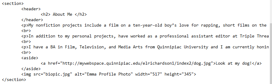 The article element is a block of self-contained content like a blog post or newspaper article. The section element is just that – a section of a document sharing thematic elements throughout. So far, all of the paragraph tags and the bio image could be classified as a section since it is an “about me”.