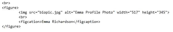 The figure and figure caption elements define a graph, table, or image and it’s caption. While I would not normally call a profile photo a “figure”, for the sake of learning semantics I will.