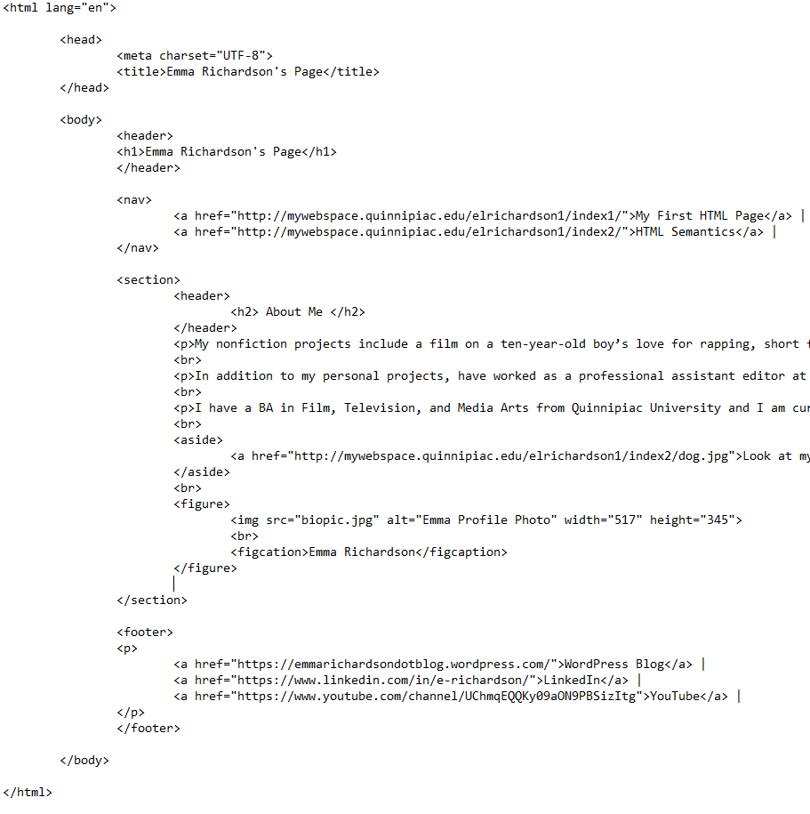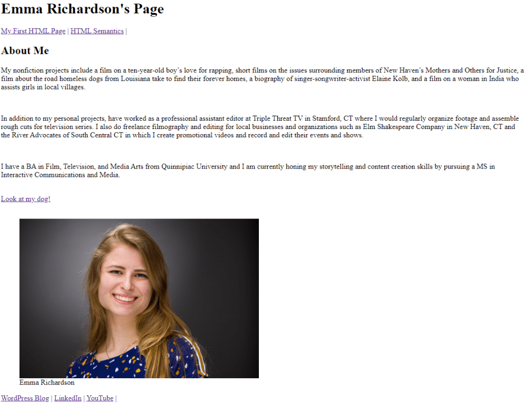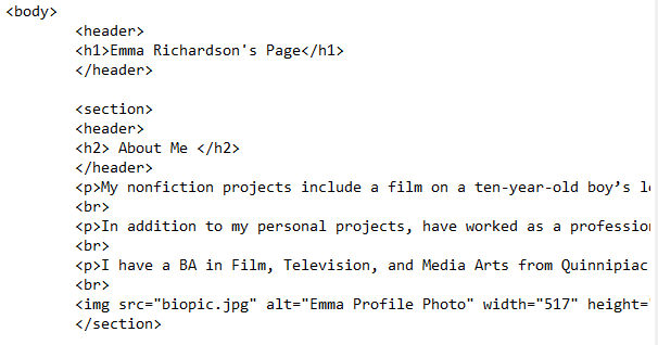 The header element is where the heading, logo, and basic information (like date, author, ect.) would go. In my current code there is a heading, but there is no semantic tag to point it out. I added a header to both the page’s header and to the “About Me” section.