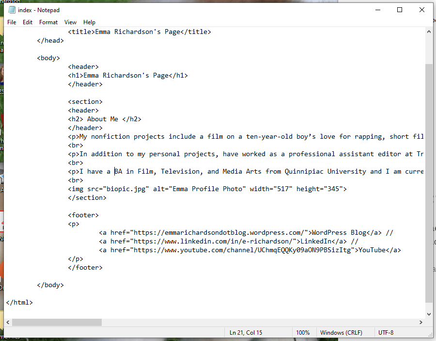 Be sure to test the links as you go by keeping the html file open in you web browser and refreshing as you make changes. I almost included a broken link because I didn’t include the “https://&#8221; before – something that I would not have realized had I not checked.