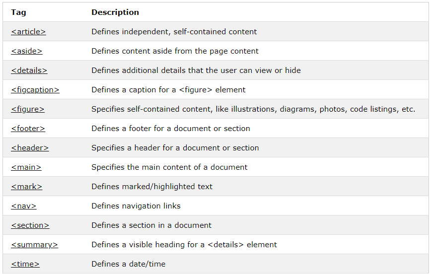 They are split into sections called “blocks”. Below is a table form W3Schools that lists each semantic element and its basic function. I will explore each of these elements as I modify my first html page.