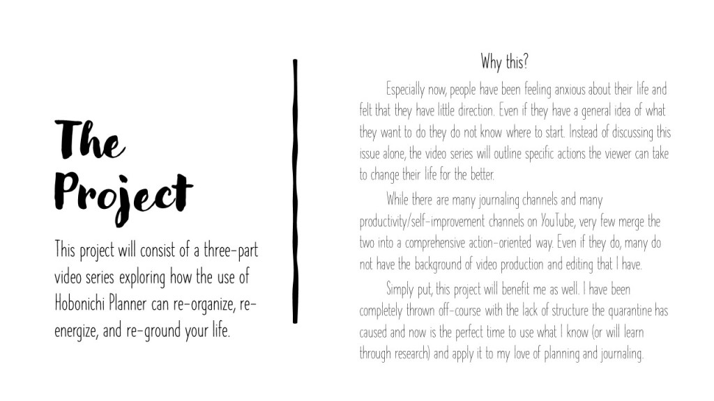 First of all, there is not anything like this out there. There are tons of productivity YouTube Channels out there like Matt D’Avella, Rowena Tsai, and Better Ideas that explore the ideas of productivity and self-improvement but it does not go as far as to create an action plan that could sustain any veiwer’s interests and goals. The same can be said for journaling channels like AmandaRachLee, procrastinate_create, and studyquill that are excellent at showing what works for them when it comes to journaling, but it is rarely based on research and may be a little intimidating to newcomers.