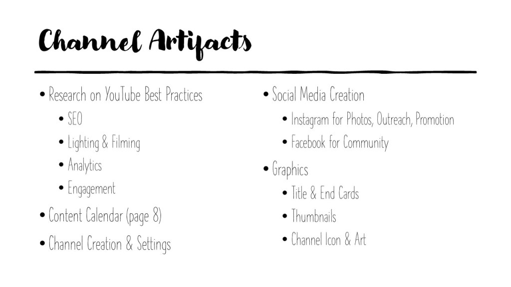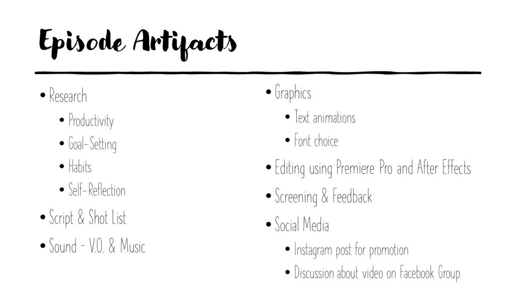 Then it was time to gather all of my thoughts and ideas into a comprehensive presentation, as if I were pitching this idea to a business. Within this document I lay out the main goal, all the artifacts I will need, the content calendar, and an overview of each episode. While it is less formal-looking than most business proposals, I think it suits the aesthetic of the project well and gets everything that I need to say across to the reader.