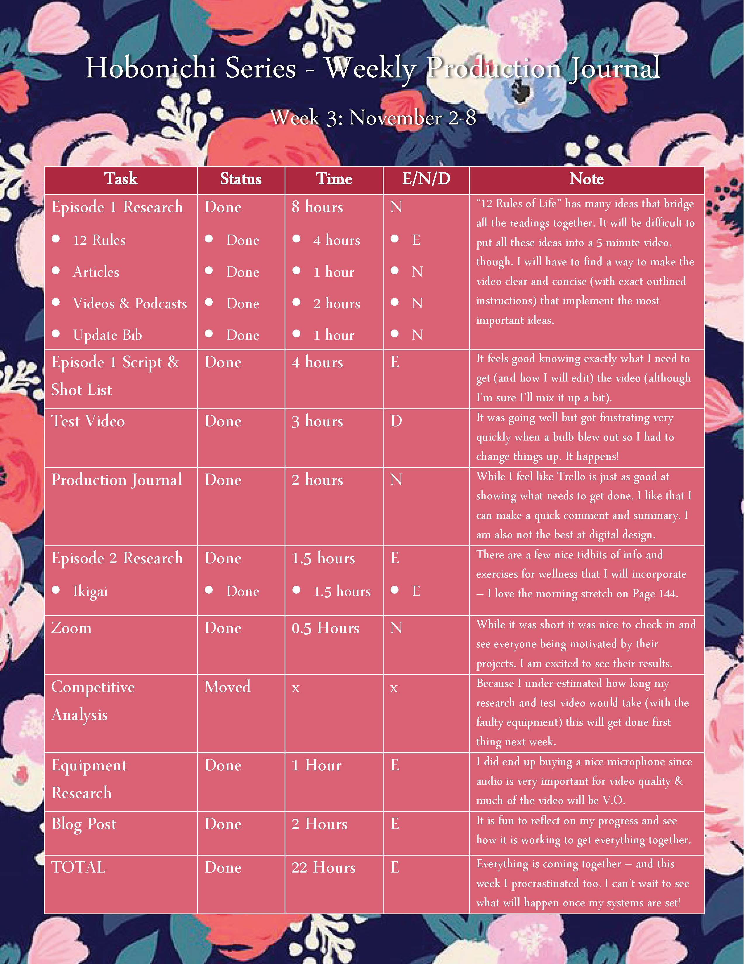 Over the course of seven weeks I planned, researched, and produced a three-part YouTube video series on how to use the Hobonichi Cousin planner for optimal productivity, creativity, and mental wellness.