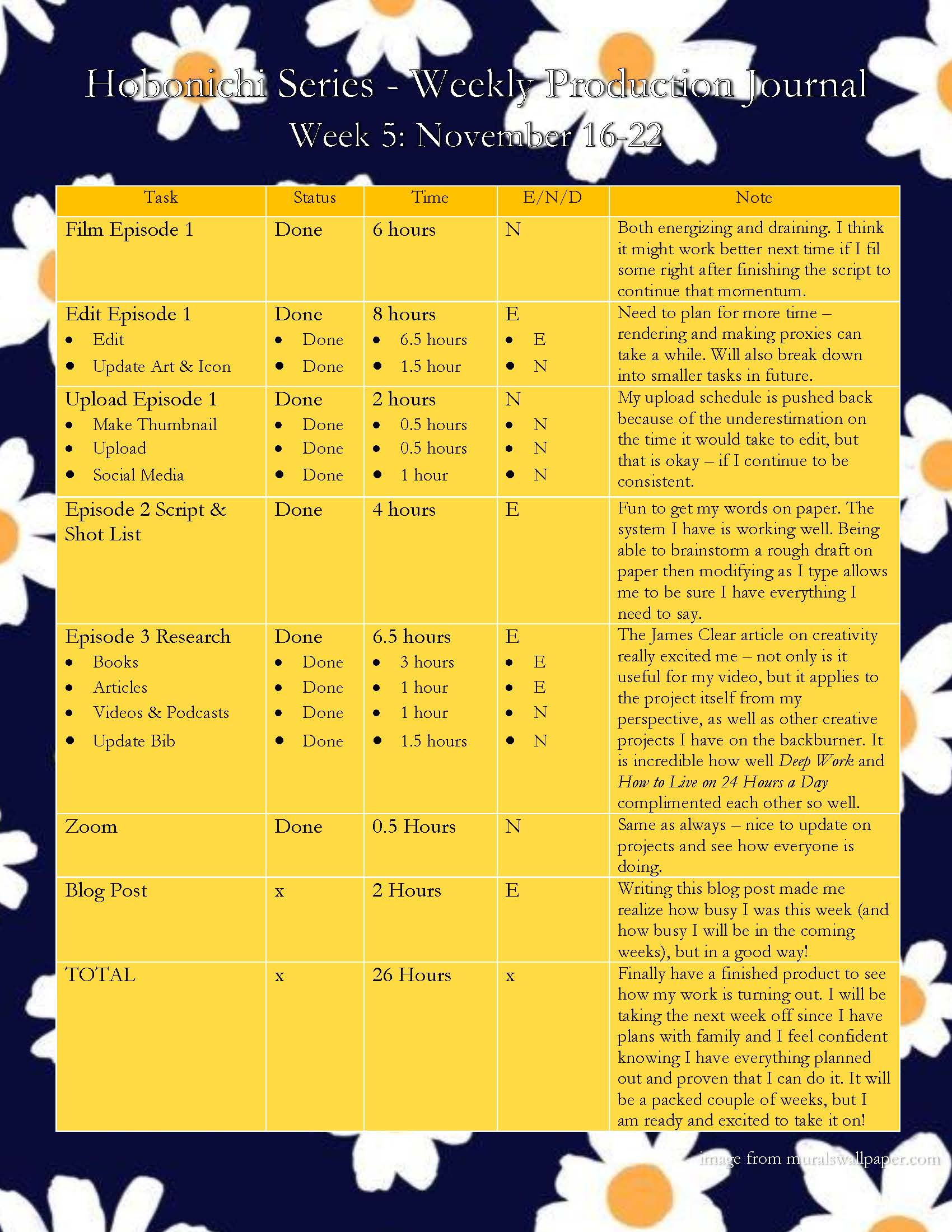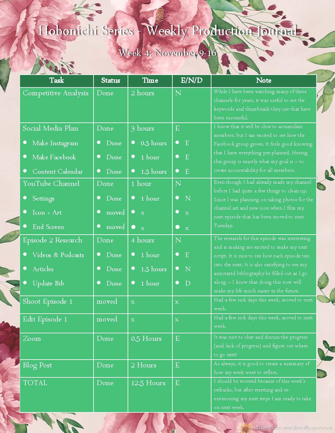Next I set up a production journal so I could take stock of each task every week. It was important do do this step so that I could see how long tasks took and whether the task energized or drained me so I could improve the process as the project continued.