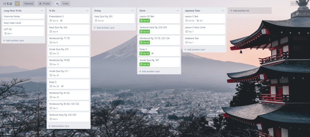 For more linear projects, I chose to go with the Kanban method for my lists: To-do, Doing, and Done. As you can see I also added “long-term to-do” for things that are longer-term goals and a list for my weekly tutoring sessions. Since it is so easy to create the cards, I went through my syllabus and added the rest of the assignments for the semester to the “To-Do” list- I will simply drag the cards over to “Doing” once they are assigned in class.