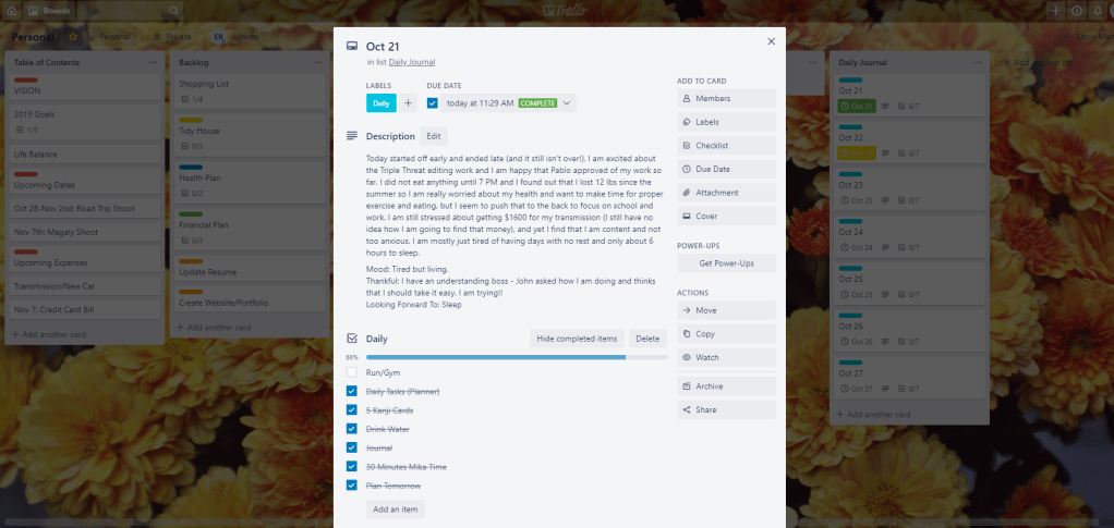 Finally, there is the “Daily Journal” list to promote creating the right daily habits. This list has a card for each day that includes a daily journal, some quick check-in questions (I chose mood, thankful, and look forward to), and a daily checklist.