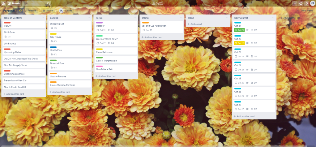 My first “Personal” Trello board looked like this. I thought it would be best to separate my lists by each aspect of my life that I wanted to improve upon. However, it somehow ended up looking bleak and overwhelming at the same time.